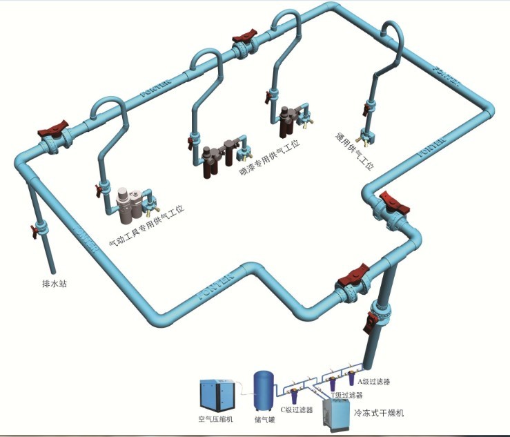 車間壓縮空氣管路分總管、干管和支立管。車間壓縮空氣管路可采用架空敷設、地溝敷設、埋地敷設或架空、埋地相結合的敷設方式。為便于管理與維修,應以沿墻或柱子架空敷設為主,架空敷設高度以不妨礙交通為原則,但一般不小于2.5m,并盡量減少對采光的影響。