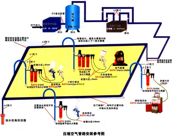 5、壓縮空氣管道安裝完畢后,應進行強度和嚴密性試驗,試驗介質一般為水。當工作壓力P<0.5MPa時,試驗壓力Ps=1.5P,但Ps ≮0.2MPa; 當工作壓力P≥0.5MPa時,試驗壓力Ps=1.25P,但Ps≮ P+0.3MPa。管路在試驗壓力下保持20分鐘作外觀檢查,然后降至工作壓力進行嚴密性實驗,無滲漏即為合格。