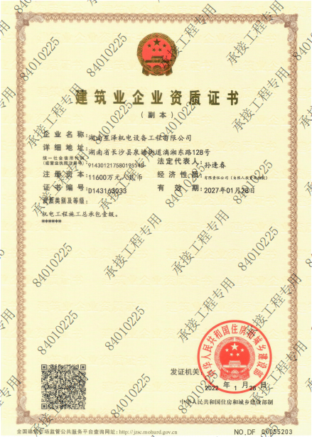 2022年1月29日,從國家住房和城鄉建設部發布的《住房和城鄉建設部關于核準2022年度第一批建筑工程企業資質名單的公告》(中華人民共和國住房和城鄉建設部公告第 17號令)中獲悉,經中華人民共和國住房和城鄉建設部批準,湖南星澤 機電設備工程有限公司成功晉升為機電工程施工總承包一級資質!