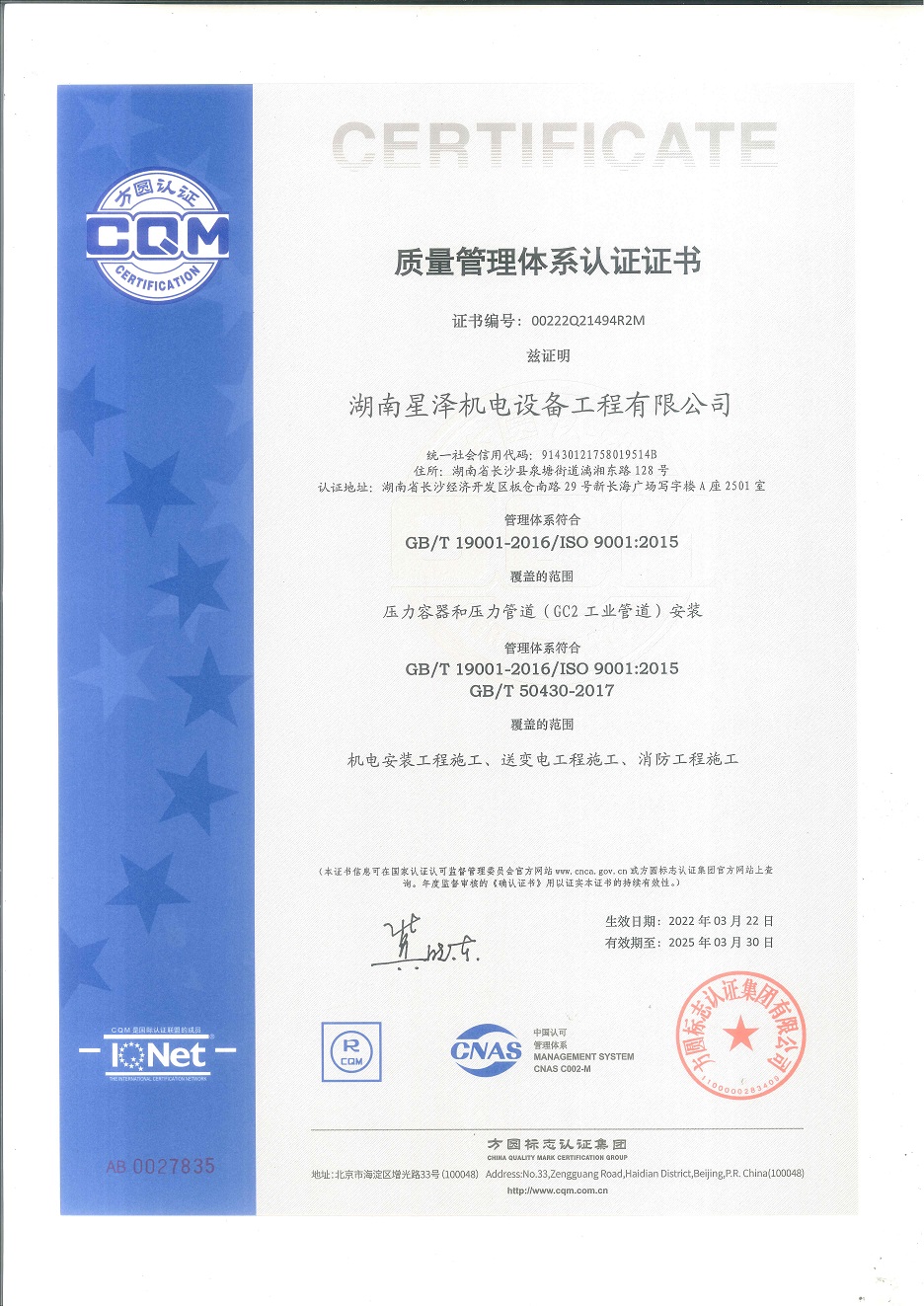 3月中旬,由方圓標志認證集團公司組織三位體系審核專家組到我公司進行質量、環境、職業健康安全管理體系再認證,審核范圍包括機電安裝工程施工、送變電工程施工、消防工程施工、壓力容器和壓力管道(GB1公用管道)安裝及相關的管理活動審核。