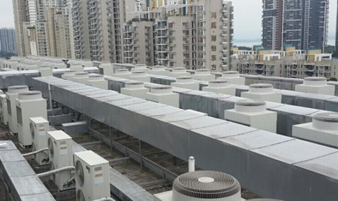 賽博電子廣場中央空調安裝工程建筑面積為106500平米,功能有一至五層為賣場,六層以上為寫字樓和商務居住,中央空調主機采用遠大BZB—250Ⅴ型直燃機組,空調末端采用清華同方吊頂式空調機組,循環水泵選用上海凱泉產品,水過濾器和電子除圬儀選用長沙多靈公司產品,風管采用江蘇德通復合風管材料,水管保溫采用華美橡塑材料,二臺500T康明冷卻塔安裝于28層頂,戶外管道施工有一定難度!在中央空調安裝室內空調機組時公司采用前后配置消聲器消聲的辦法使設備噪聲降到理想壯態。