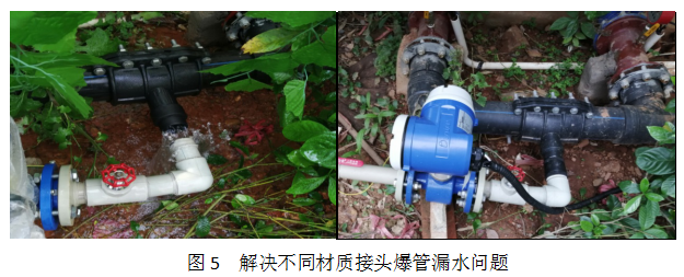 2、管類不一,現場水表安裝的管道材質有多種,有鑄鐵管、鋼管、PPR、PVC、PE等,管徑從DN25-DN150不等。由于各種管道的施工工藝不一樣,對現場技術人員技能水平提出了一定考驗。其中值得一提的是甲方原有一處管道從PE管開了一個三通,在三通管直接熔接了PPR管,因兩種不同材質膨脹系數不一樣,時間一久就爆開了。我司施工技術人員經驗豐富,使用PE和PPR轉換接頭,快速成功的解決了問題,消除了隱患。
